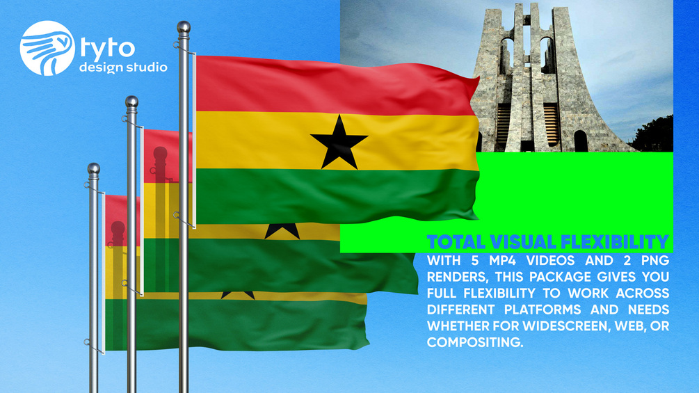 You will receive 5 video files in 4K resolution, showcasing the official Ghana flag in multiple camera angles and background options: